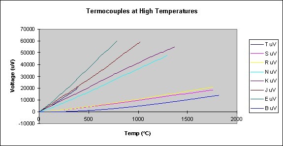 以下圖表顯示的是在不同溫度時熱電偶輸出的電壓值。注意白金熱電偶的輸出電壓較小,這就正好說明了為什么它們不能被用于高溫測量。 | |||||