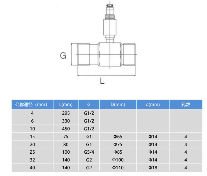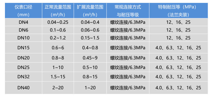 儀表口徑(mm) 及連接方式 | 4、6、10、15、20、32、40采用螺紋連接 |